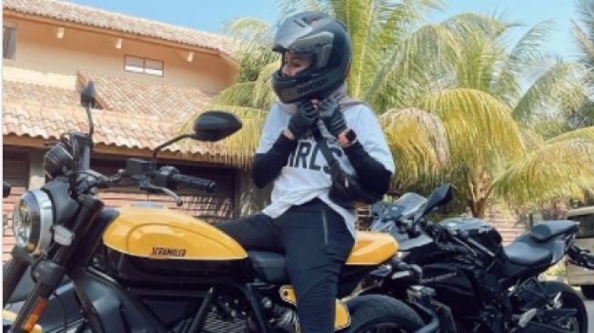 Olla Ramlan selalu mengabadikan gayanya naik moge dengan foto biasa atau selfie. Kali ini ia berpose dengan motor serba hitam. Olla sudah memakai helmnya dan siap meluncur di dalam potret tersebut. Olla tampaknya sangat menikmati hobi barunya ini. Tak banyak wanita yang suka naik moge karena bodinya yang besar dan berat. Namun Olla justru terlihat sangat bersemangat tiap kali naik moge.