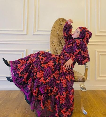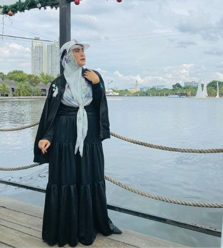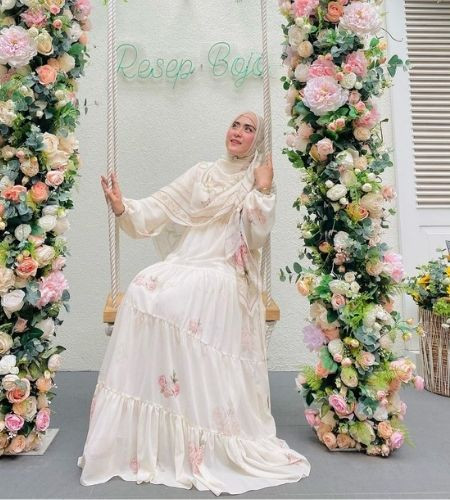 2. Tampil dengan motif floral yang lembut dan berani, membuat penampilan April Jasmine terlihat lebih anggun. Mulai dari hijab hingga gamis dengan motif yang sama.