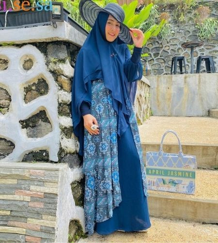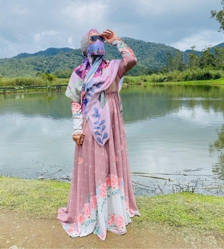 5. Selain pantai, liburan ke daerah pegunungan yang sejuk dan dingin juga bisa jadi pilihann kamu, termasuk April Jasmine. Dengan memakai hijab bermotif dan gamis yang sama, membuatnya terlihat lebih anggun.