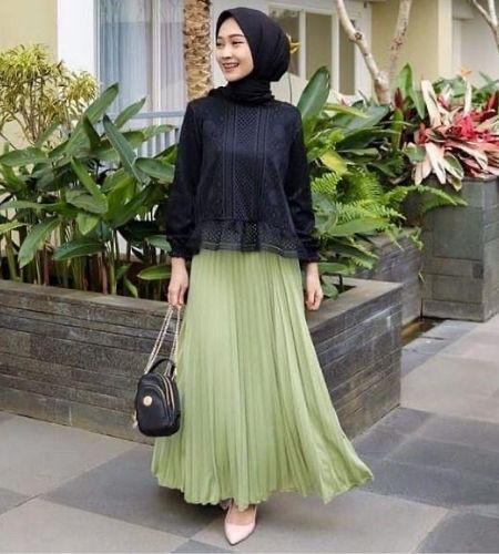 2. Rok Plisket warna hijau muda ini dengan atasan dan hijab gelap juga tidak kalah anggun, dan bisa dipakai untuk bekerja sehari-hari.