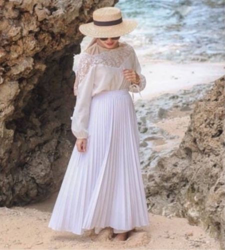 5. Rok plisket diajak ke pantai? Kenapa tidak. Padukan dengan atasan putih agar kamu tampak lebih anggun. Ditambah dengan aksesorisĀ topi yang akan menjaga kamu dari paparan sinar matahari.