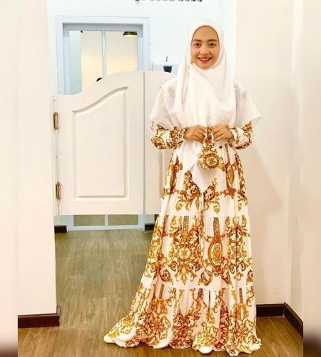 Gamis pertama yang dipakai oleh Nuri Maulida memiliki pola yang dibuat dengan warna emas, yang membuat terlihat lebih mewah. Hijab style ini sangat cocok untuk dipakai ke acara resmi.