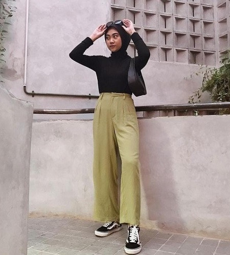 Model kulot panjang dengan atasan kaos hitam memang akan membuat siapapun yang menggunakannya menjadi trendi, walaupun terlihat simpel.