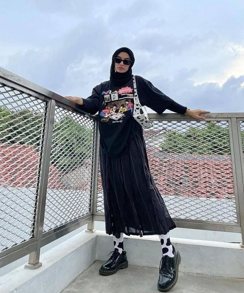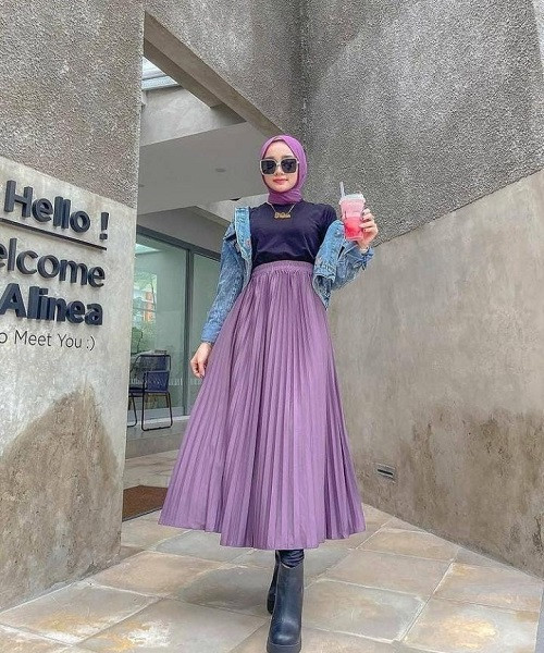 3. Memadukan kesan feminin dan boyish sekaligus, Anda bisa memadukan hijab simpel dengan rok plisket dan jaket jeans.