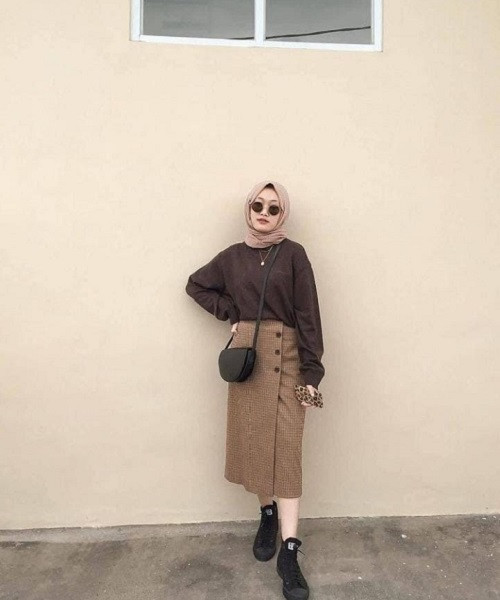 4. Rok panjang berwarna cokelat susu (coksu) yang jadi tren bisa Anda padukan dengan hijab berwarna senada dan sweatshirt agar tidak membosankan.