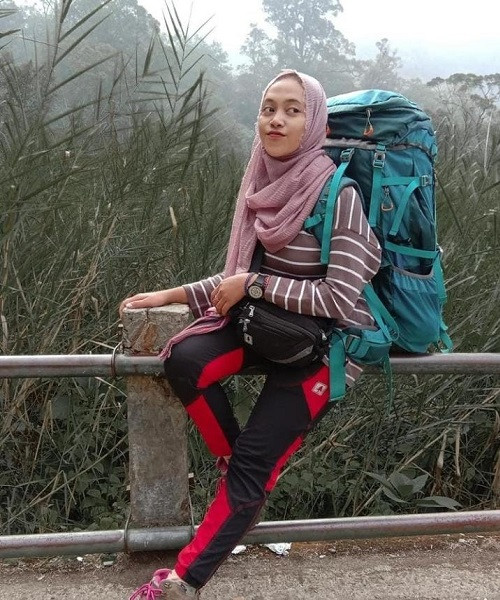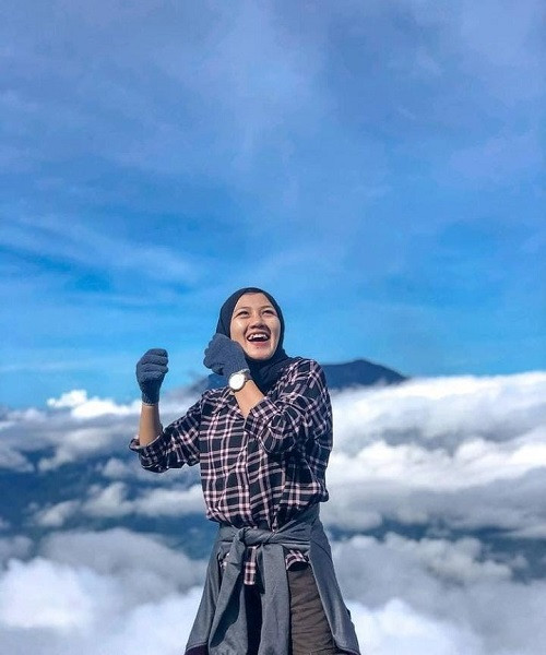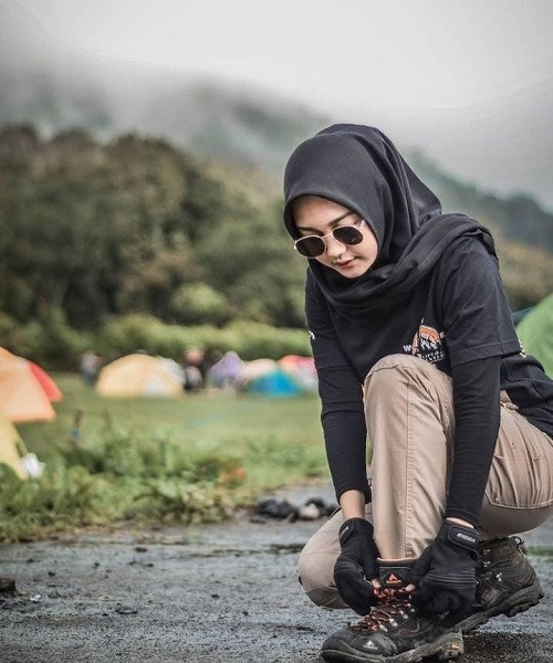 3. Bagi kamu yang ingin tampil simpel namun tetapi kekinian bisa mencoba gaya hijab yang satu ini! T-Shirt oversized dengan dalaman hitam dan celana training, cocok untuk kamu yang senang tampil kasual. Kamu juga bisa menambahkan aksesoris seperti kacamata untuk menambah keamanan saat mendaki. Outfit yang satu ini dikutip dari akun Instagram @sahabat_pendaki_.