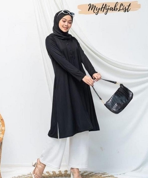 2. Tampil kekinian dengan tunik hitam polos ber-list putih seperti ini. Bentuk tunik modern big size ini sangat sopan buat dikenakan, karena mampu menutupi lekuk tubuhmu. Kamu tidak perlu khawatir lagi dengan penampilan saat berada di ruang publik.