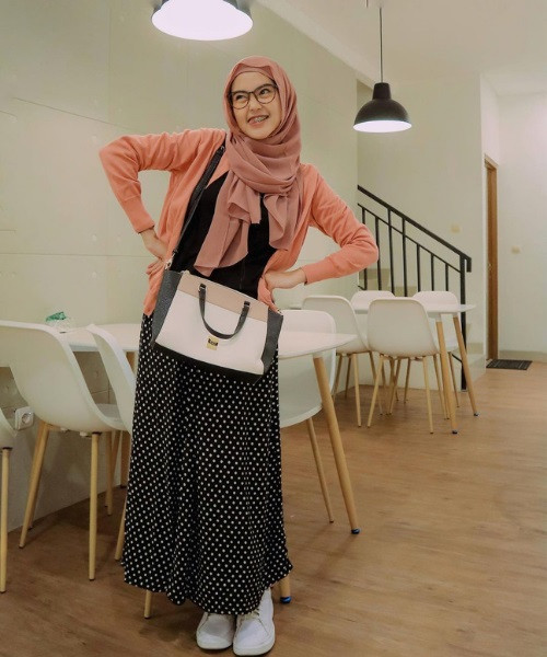 3. Busana bernuansa kalem, coba pakai cardigan warna soft pink dan rok hitam bermotif polkadot. Tambahkan juga slingbag agar penampilanmu semakin girly! OOTD hijab untuk bukber pun jadi membuat semakin percaya diri.