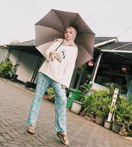 4. Namun jika kamu menghabiskan waktu di rumah saja, maka OOTD hijab yang satu ini sangat pas. Celana tidur dengan motif kartun sangat pas dengan atasan kaos dengan motif yang sama. Apalagi saat musim hujan seperti ini.
