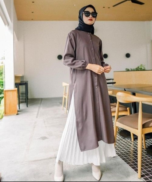 3. Tampil kalem dengan paduan tunik coklat dan rok plisket putih, membuat penampilan kamu akan lebih terlihat girly. Kamu bisa padukan dengan mengenakan heels, agar tampil lebih elegan dan menawan. Sangat pas sekali untuk pergi ke acara formal atau untuk outfit berbuka bersama dengan teman atau sahabat.