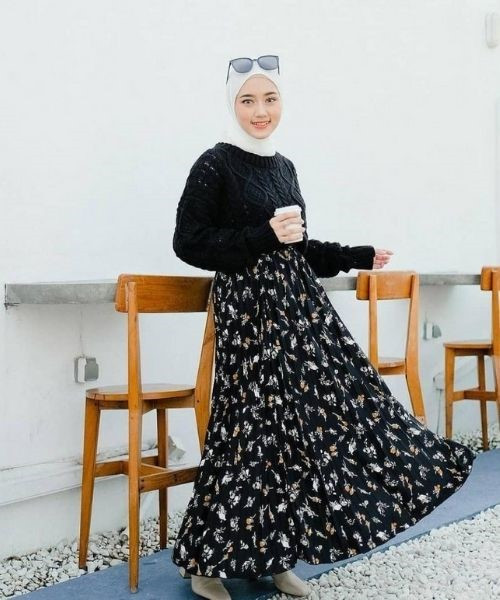 4. Sweater rajut berwarna hitam juga cocok lho dipadukan dengan rok daisy, apalagi untuk kamu yang tinggal di tempat yang dingin. Kenakan aksesoris seperti kacamata atau sling bagagar mendukung penampilan kamu lebih terlihat girly dan sekaligus elegan.