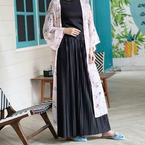 5. Rok plisket hitam memang sangat pas dengan atasan yang juga sama hitam, tetapi untuk menambah kesan feminim, pakai outer tunik dengan motif bunga.