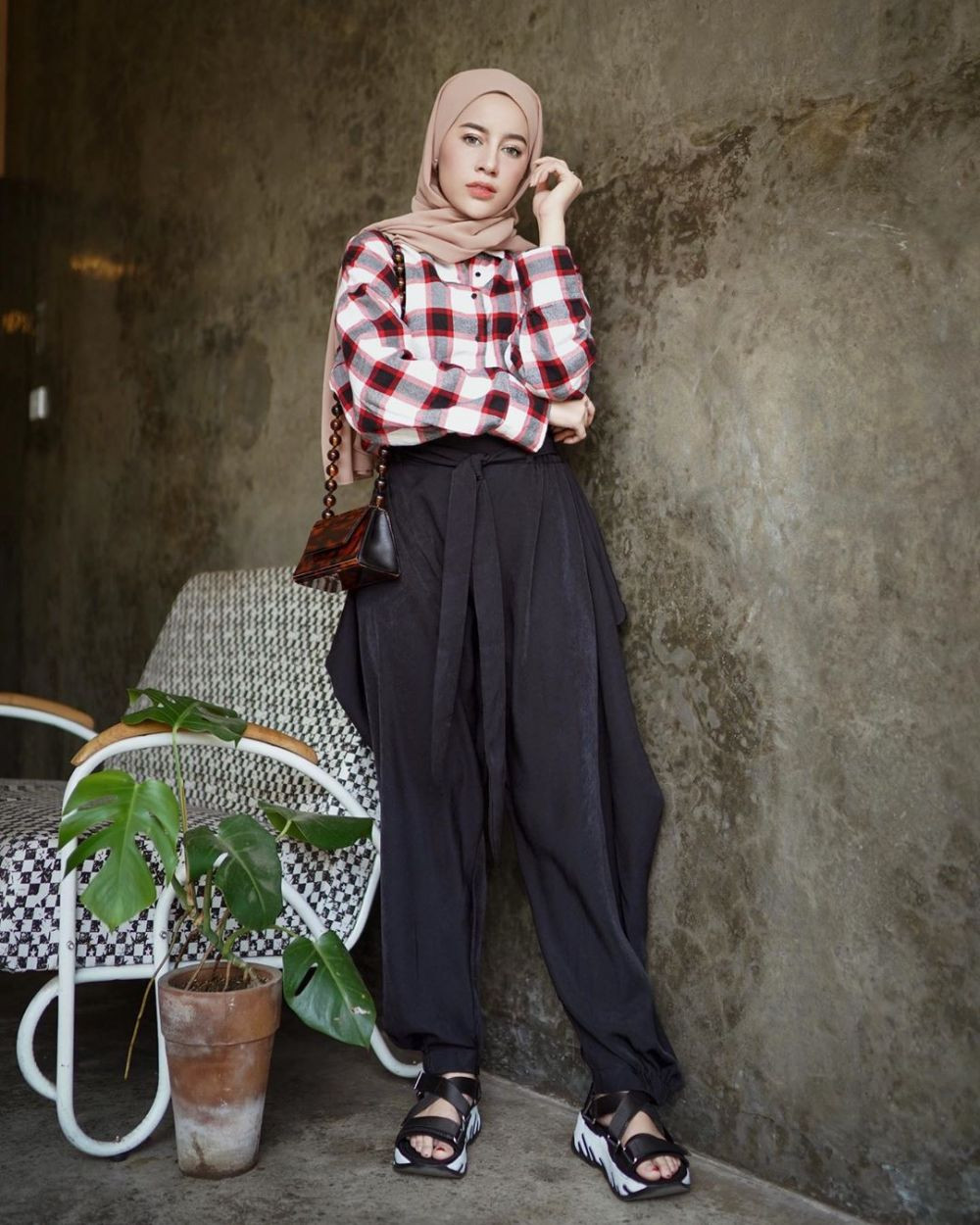 1. Perpaduan kemeja kotak-kotak dengan hareem pants ini bikin gaya makin casual. Dan yang pasti membuat penampilan kamu semakin unik.