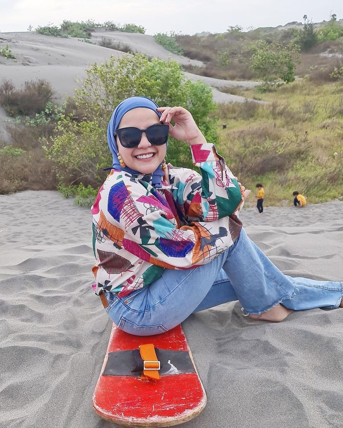 OOTD dengan blouse motif pertama terlihat Tasya kenakan dengan blouse colorfull. Blouse bermotif abstrak dengan warna colorful ini Ia kenakan saat berlibur dan berfoto di gumuk pasir, Daerah Istimewa Yogyakarta. Tasya juga terlihat mengenakan aksesori berupa strap glasses atau tali kacamata.