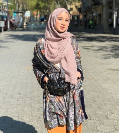 Gaya hijab saat travelling ala Chacha Frederica terlihat modis dengan sentuhan motif floral dan mengkombinasikan warna earth tone pada bawahannya. Pemilihan pashmina warna kalem membuat tampilan hijab jadi terlihat fresh. Gaya Chacha makin hits dengan waist bag warna hitam.