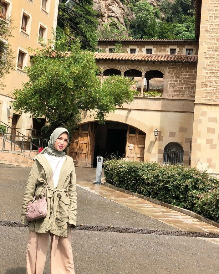 Kalau kamu tidak suka outfit yang terlalu terang dan menarik mata, bisa coba gaya Chacha saat jalan-jalan ke Barcelona ini. Chacha memadukan kaus putih dengan jaket parka, hijab, dan celana dengan nuansa warna earth tone yang kalem. Gaya hijab saat travelling ala Chacha Frederica terlihat chic dengan sentuhan motfi floral dan mengombinasikan earth tone pada bawahannya. Pemilihan pashmina warna kalem membuat tampilan hijab jadi terlihat fresh. Gaya Chacha makin hits dengan waist bag warna hitam.