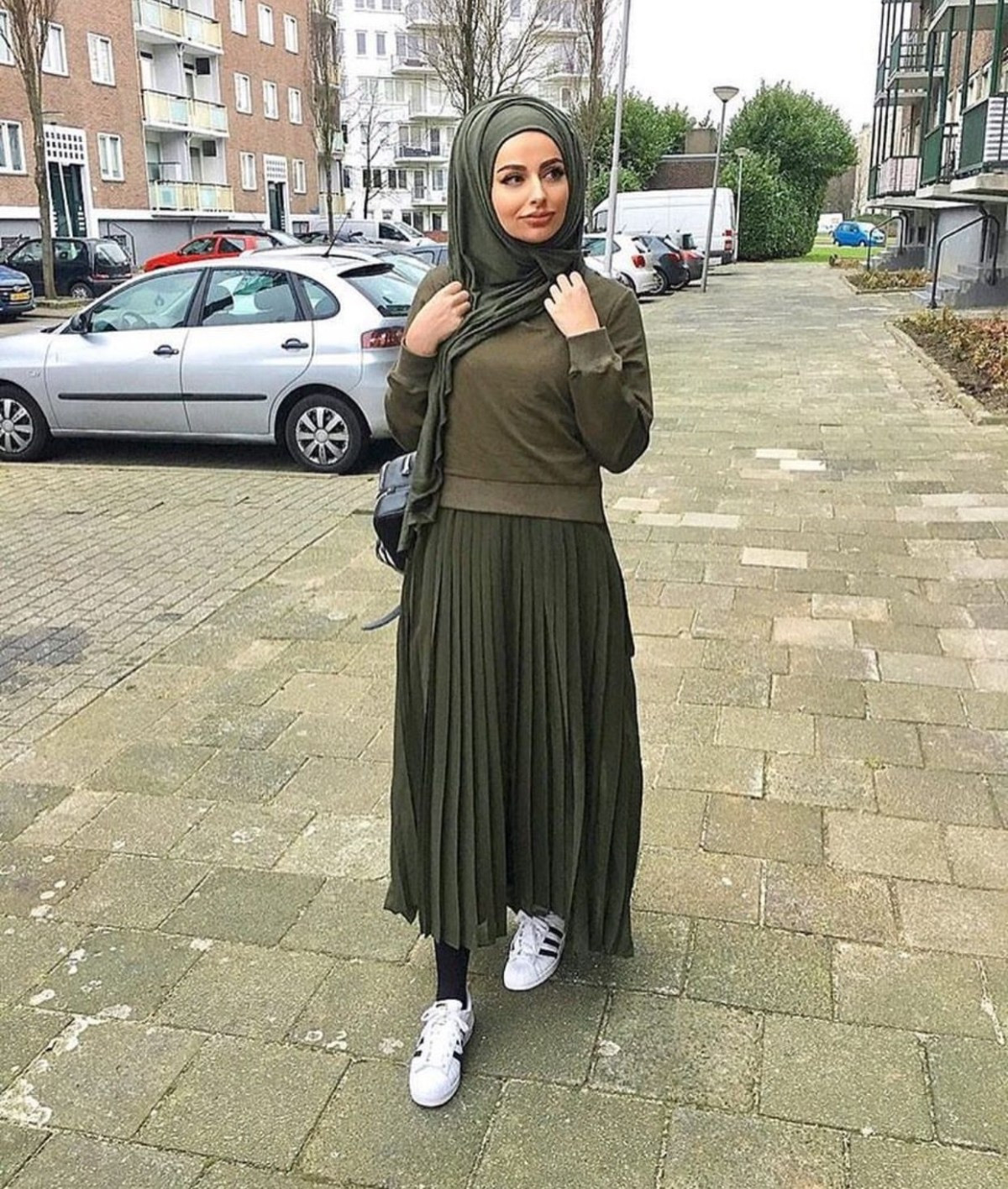 Untuk menghasilkan gaya stylish dengan warna hijau army, maka Anda dapat mengenakan rok dengan model plisket seperti yang digunakan Meirani Amalia kali ini dia memadukan dengan blouse bermodel lengan yang unik membuat terlihat semakin feminim dan manis. Dengan menggunakan hijab bewarna coklat yang sangat cocok dipadukan dengan army.