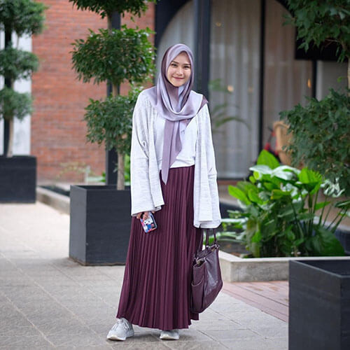 Penggunaan rok rempel berwarna ungu dengan atasan kaos putih dan jilbab abu-abu, lalu dipadukan dengan cardigan motif panjang warna putih dan sneaker putih agar tampilan lebih maksimal. Gaya di atas adalah pilihan terbaik dari style cardigan panjang wanita muslimah model hijab terbaru.