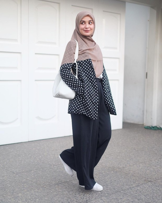 Untuk penampilan kerja saat new normal Shireen Sungkar menampil gaya yang cocok banget untuk kamu jadikan inspirasi. Kamu bisa memadukan kemeja putih dengan celana wide leg pants kemudian di-layer kembali dengan polkadot blazer.