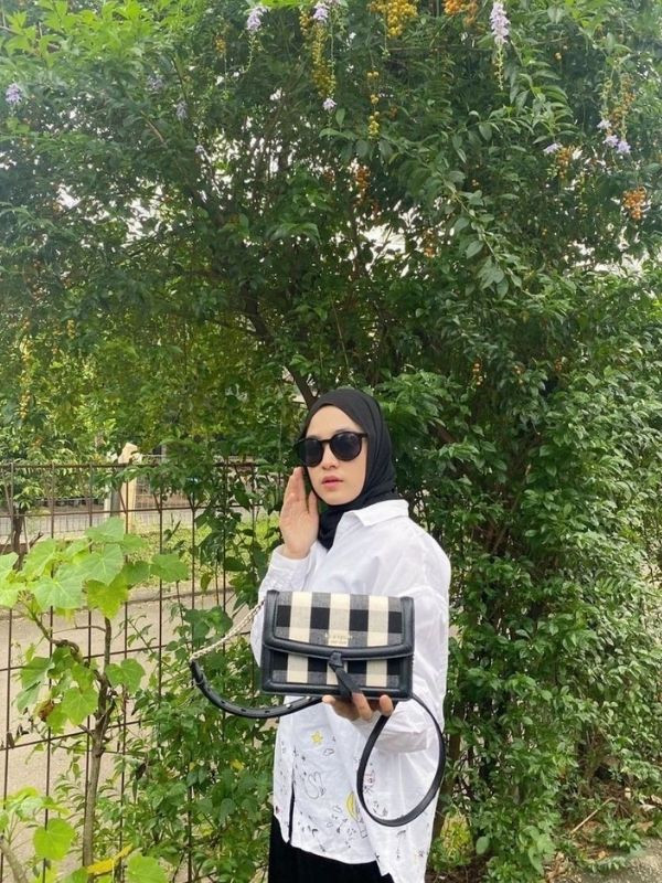 Kemeja putih dipilih Syifa untuk melengkapi penampilan simple-nya kali ini. Tak banyak menggunakan aksesoris, dara cantik berusia 22 tahun itu hanya tampil dengan kacamata hitam dan sling bag berwarna senada. Ia pun kembali mengenakan hijab hitam tanpa motif untuk menutup penampilannya.