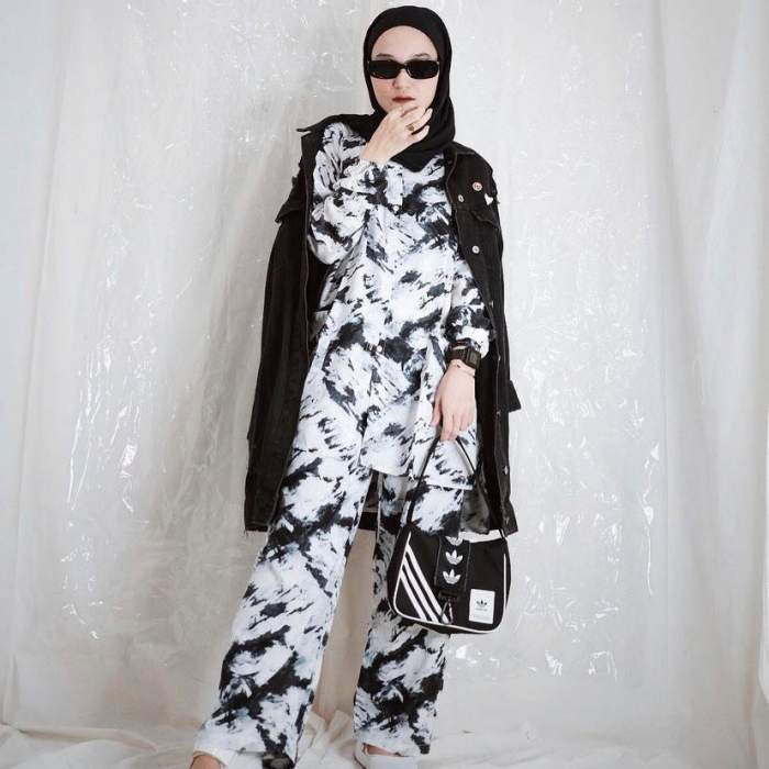 Setelan tie dye hitam putih tanpa tambahan apapun mungkin akan terlihat membosankan. Untuk terlihat stunning dengan setelan ini, kamu cukup gunakan jaket oversized dengan warna gelap seperti hitam. Kombinasikan OOTD satu ini dengan kerudung yang berwarna selaras setelan tie dye. Tambahkan pula aksesoris seperti sunglasses dan tas jinjing untuk melengkapi penampilan. Perpaduan outfit ini cocok digunakan saat hangout dengan teman ataupun ketika menghadiri acara,