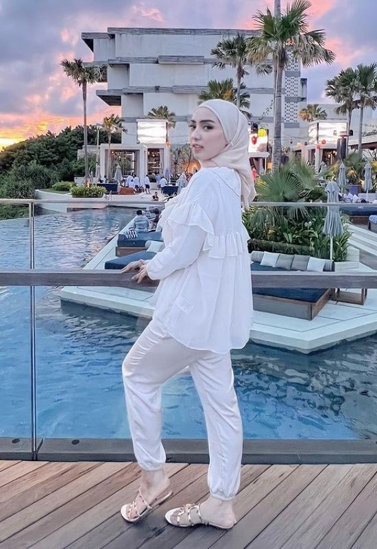 2. Masih dari outfit ke pantai ala Dinan Nurfajrina, namun kali ini bernuansa putih dan dengan atasan derta bawahan yang simple. Demikian juga dengan hijab yang dipakai, tidak terlalu banyak aksesoris.