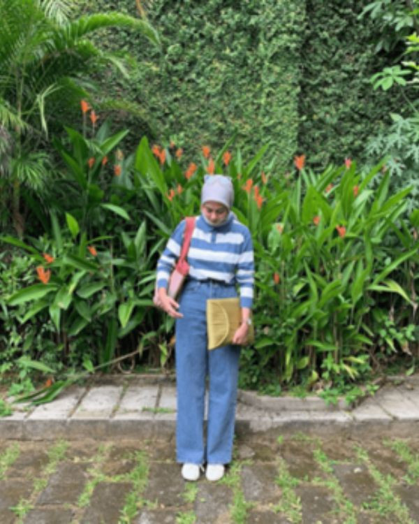 Menggunakan blouse stripe berwarna biru putih yang dipadukan dengan celana jeans model wide leg pants, cocok buat Anda pecinta gaya casual yang simple banget!