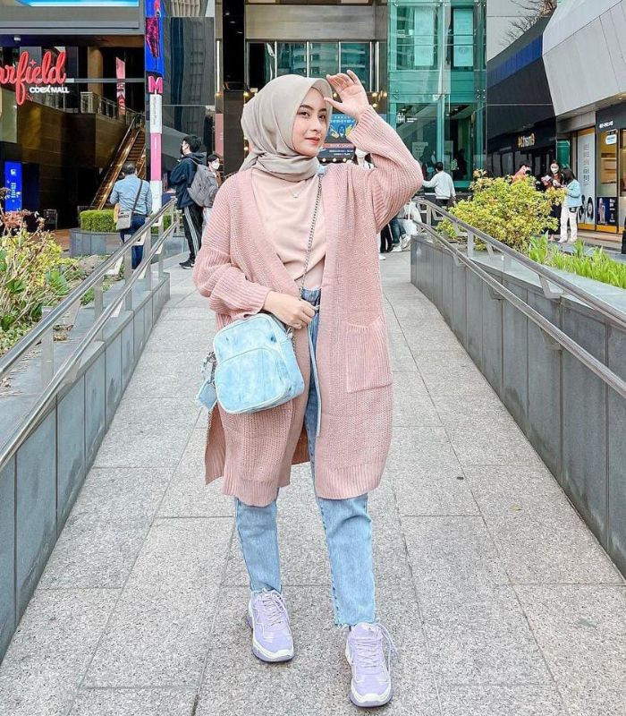 Tampil stylish dan trendi dengan boyfriend jeans dipadukan dengan sweatshirt dibalut dengan long knit outer favoritmu ditambah sling bag, gayamu semakin preppy chic!