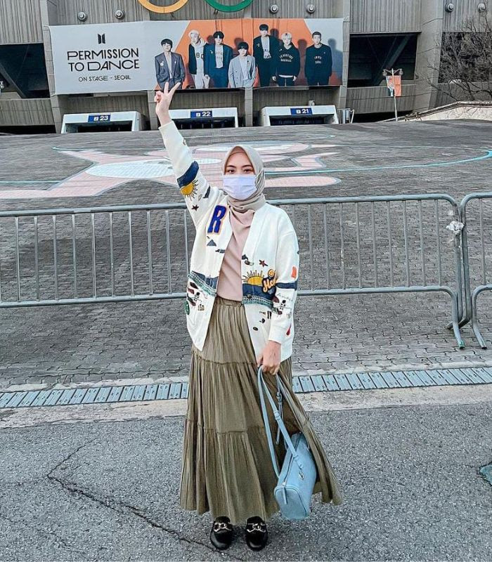 Mix and match antara ruffle skirt army dengan cardigan putih bermotif, membuat OOTD Anda tidak akan membosankan saat dipandang.