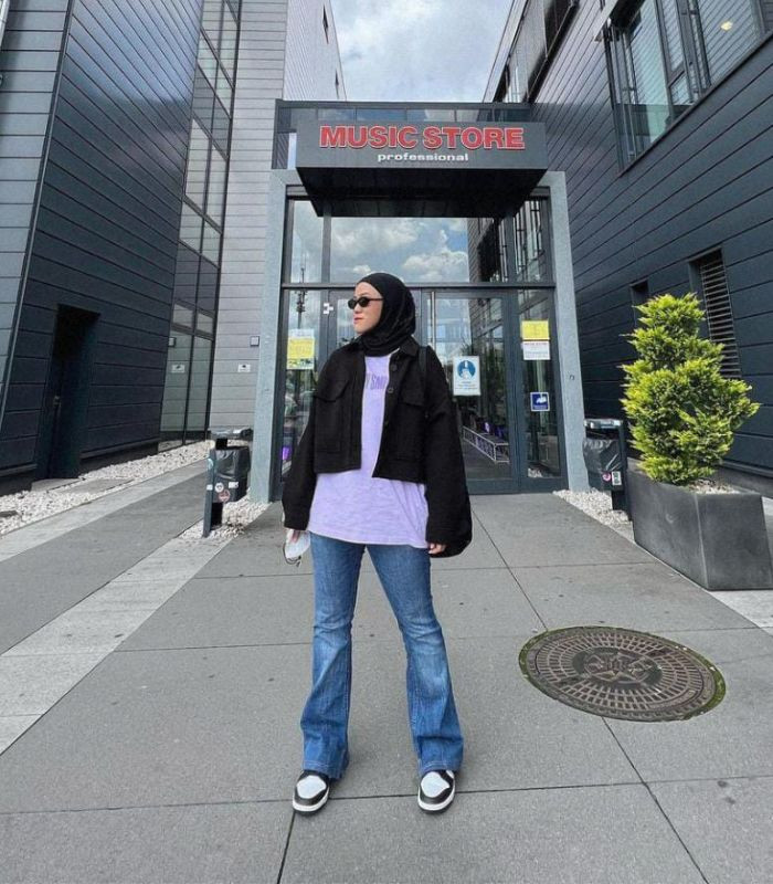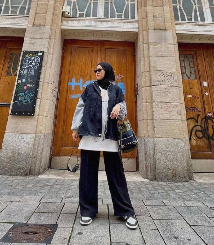 8. Tampilan yang satu ini bikin gaya Anda jadi makin modis. Sweater oversize dipadukan dengan jaket jeans dan kulot berwarna hitam ditambah kacamata. Outfit classy ini bisa banget buat dicoba!