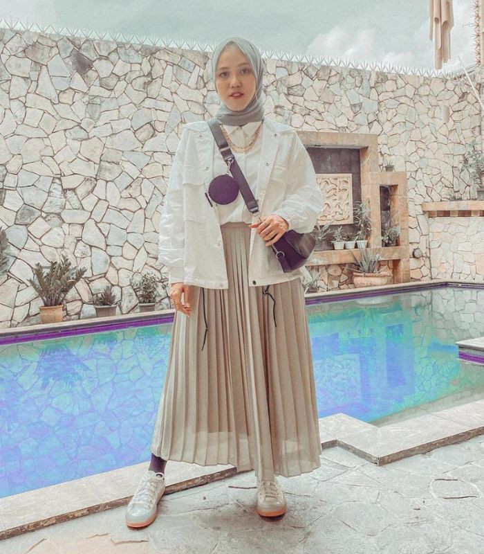 6. Perpaduan Jaket dan kemeja dengan warna senada dilengkapi dengan plisket skirt warna nude ditambah sling bag bikin kesan tampilan Anda bernuansa nude seperti ini.