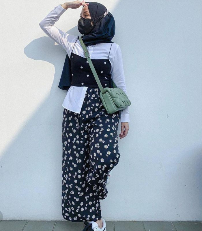 7. Perpaduan kemeja dan crop top motif ini di mix dengan celana kulot motif bunga. Bikin kesan Anda semakin kalem yang manis!