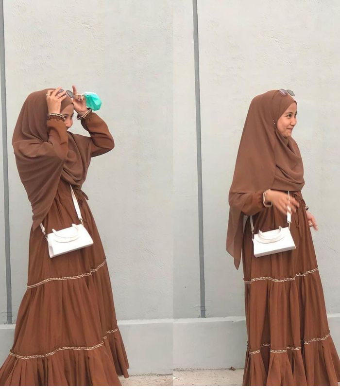 1. Midi dress satu ini hadir dengan model truffle dress yang berwarna coklat dipadukan dengan pashmina berwarna senada serta sling bag dan kacamata bikin tampilan Anda kalem dan cute!