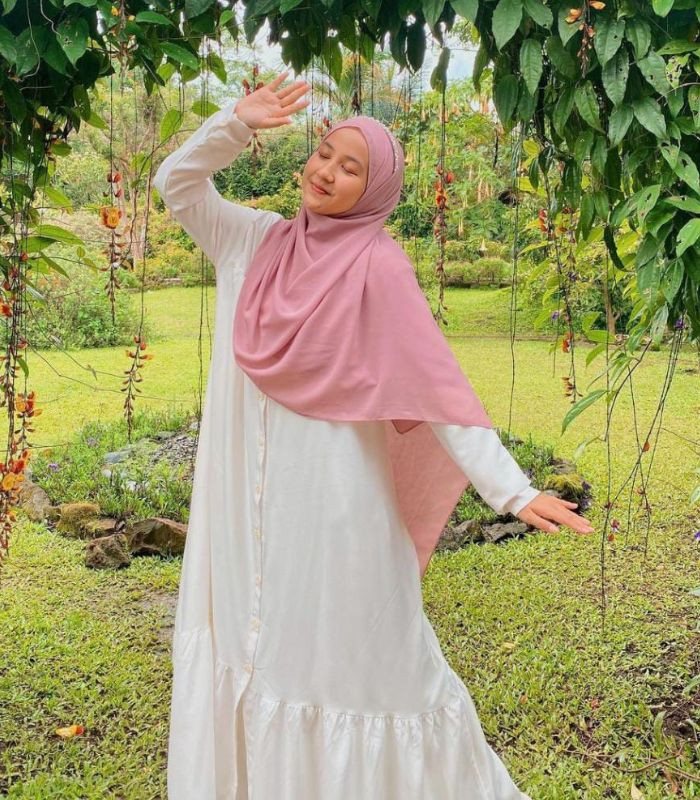 2. Ingin tampilan Anda lebih menawan? Pilihlah midi dress berwarna putih seperti ini yang dapat dipadukan dengan pashmina dengan warna favoritmu. Tampilan Anda bikin cantik dan elegan, cocok untuk berbagai acara.