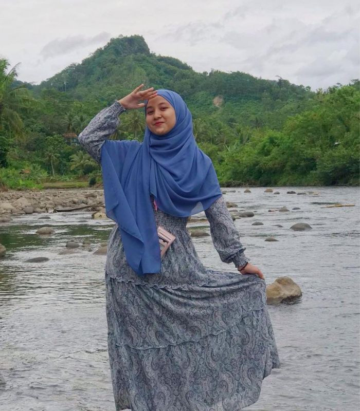 3. Bikin gaya Anda yang simple, coba pilih model midi dress truffle bermotif ditambah dengan pashmina plain seperti ini, buat kamu jadi lebih feminin!