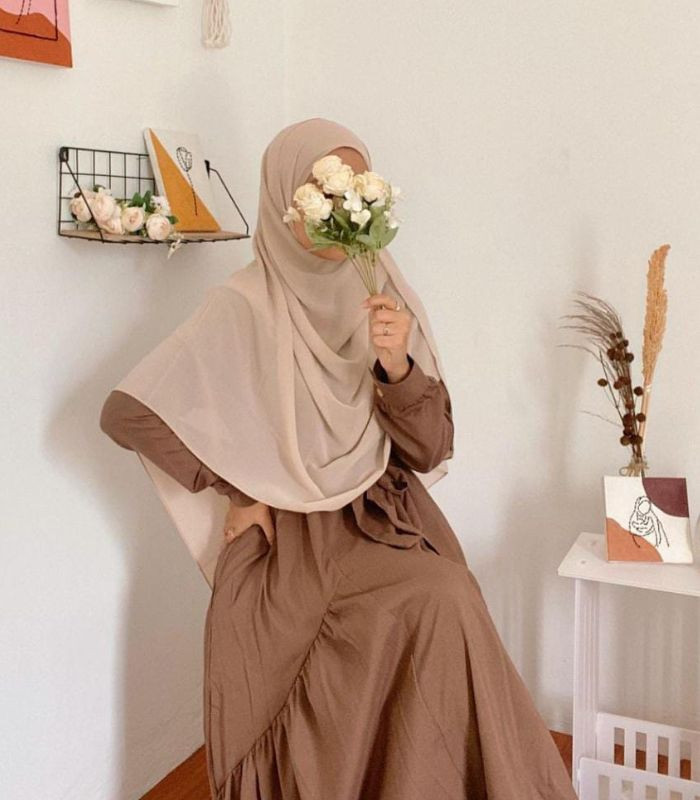 4. Mengusung konsep warna kekinian yaitu nude, memberikan tampilan Anda semakin kalem dan manis saat memadukan midi dress truffle berwarna coklat dan pashmina soft nude seperti ini.