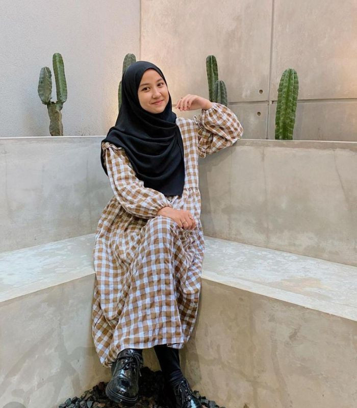 5. Midi dress motif kotak-kotak yang satu ini bisa menjadi pilihan gaya hijab saat hangout bersama dengan teman ataupun sahabat.