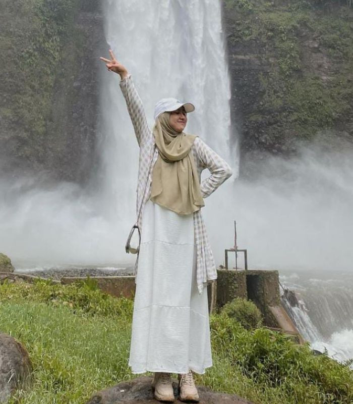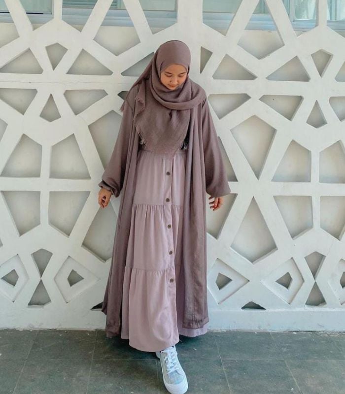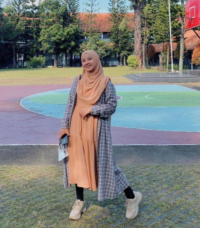 7. Midi dress kekinian dengan warna soft yang dipadupadankan long outer seperti ini ditambah sneakers bikin gaya hijab Anda terkesan formal namun tetap nyaman.