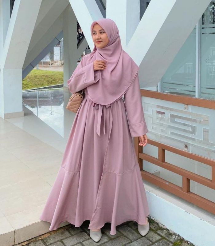 9. Pilihan midi dress dengan warna soft mauve seperti ini memperlihatkan gaya hijab yang simple namun memberikan kesan lebih anggun.