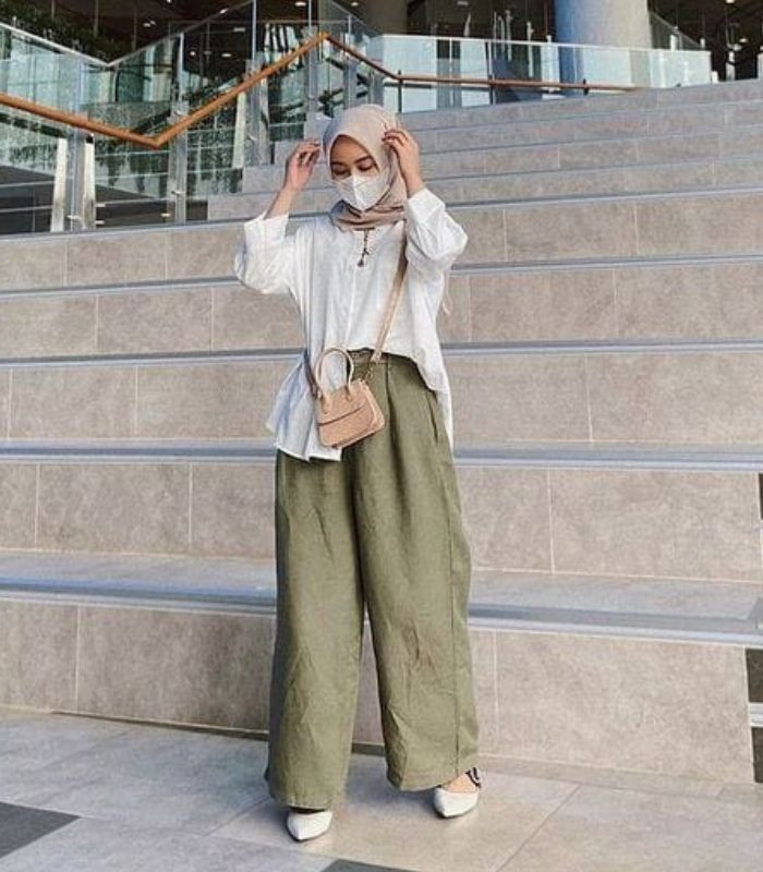 10. Terakhir, gaya hijab satu ini terkesan simpel dengan memadukan kemeja putih dan celana kulot serta tambahkan sling bag dan hijab square dengan warna senada.