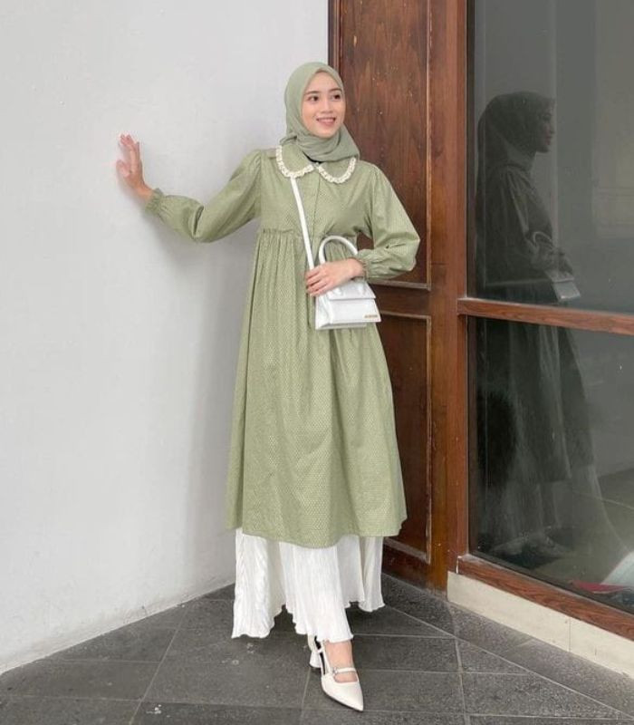 1. Mix and match semi tunik motif kotak-kotak dengan rok berwarna matcha dan pashmina seperti ini memberikan kesan casual tapi effortless!