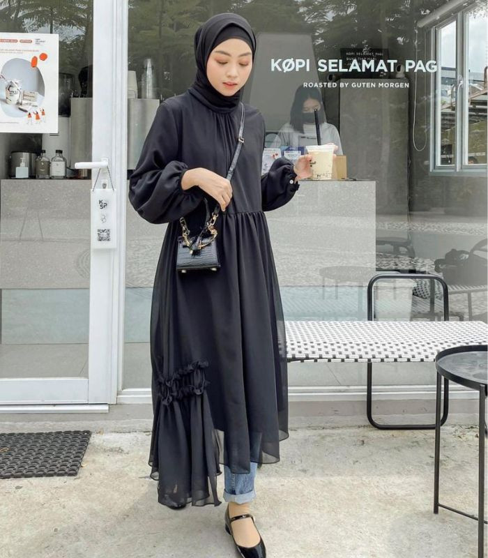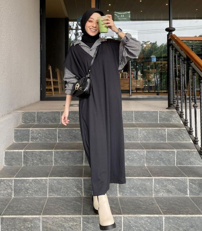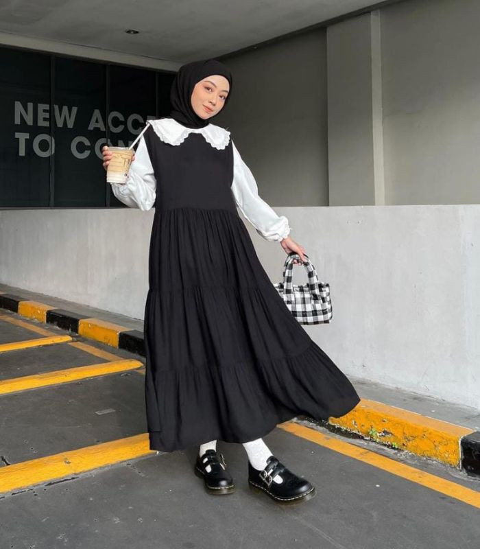 5. Cocok bagi Anda yang ingin tampil simple, kenakan long dress dan pashmina hitam yang senada dilengkapi dengan sling bag putih, tampilan Anda makin chic look, lho!
