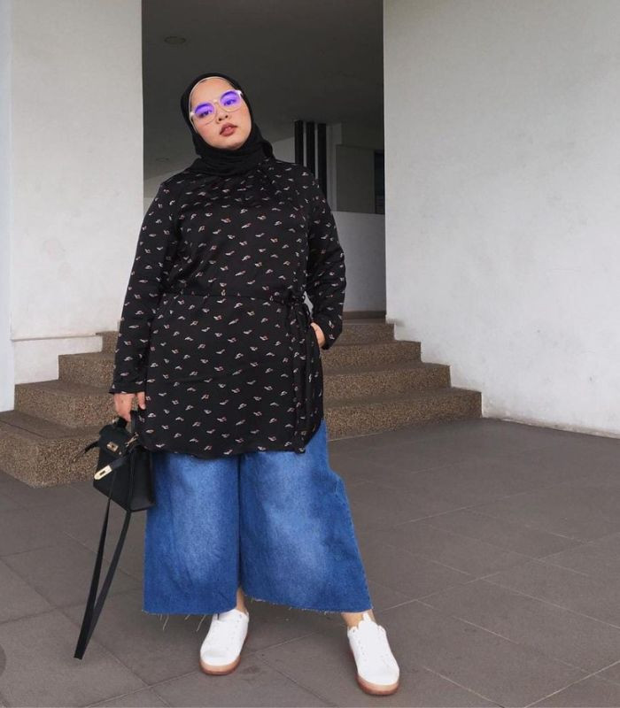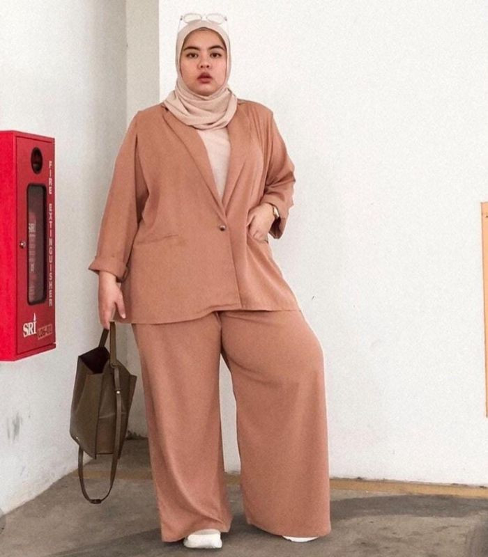 7. Buat Anda yang ingin percaya diri dengan tampil relaxed style, Anda dapat mencoba one set seperti ini dipadu bersama blazer dan cullote yang dilengkapi dengan t-shirt dan pashmina warna senada.