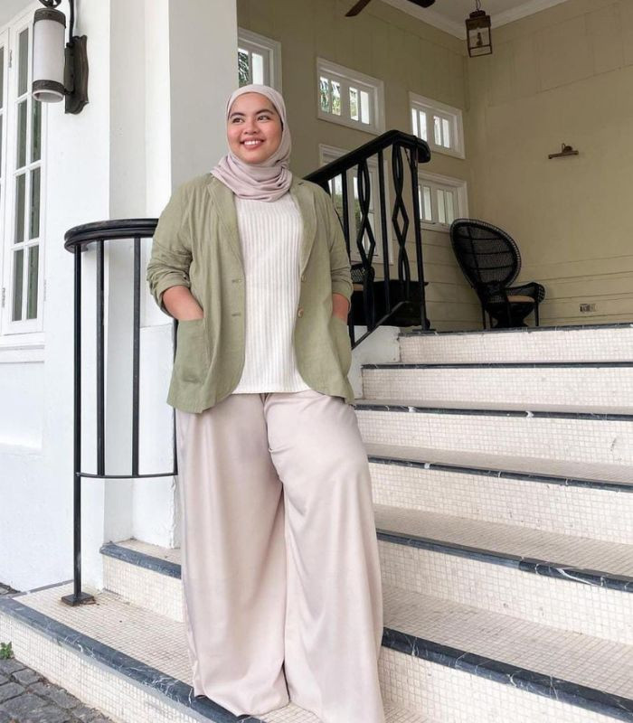 6. Fashion hijab seperti ini cocok untuk Anda ketika hangout bersama teman atau sahabat. Gunakan t-shirt plain dipadukan dengan blazer sage green dan cullote pants dan hijab dengan warna senada, memberikan kesan simple tapi effortless!