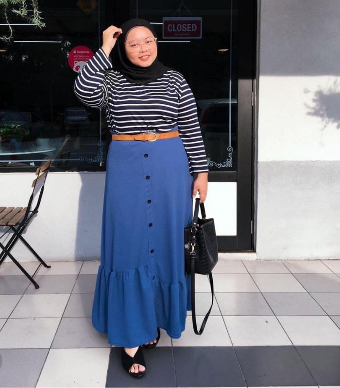 8. Terakhir, gaya satu ini pas buat OOTD ke kampus. Coba Anda mix and match striped oversized long sleeve t-shirt motif black & white dengan rok denim, sling bag dan wedge heels.