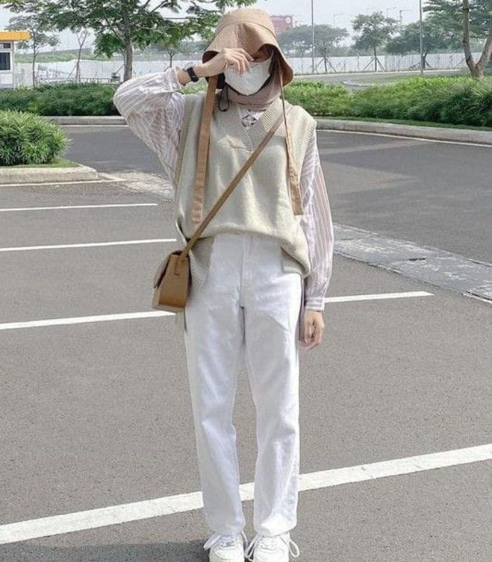 3. Cocok untuk Anda yang ingin tampil gaya hijab simple, gunakan sweater crop bersama highwaist linen dilengkapi dengan shoulder bag, slip on sandals, dan bucket hat favorit Anda!