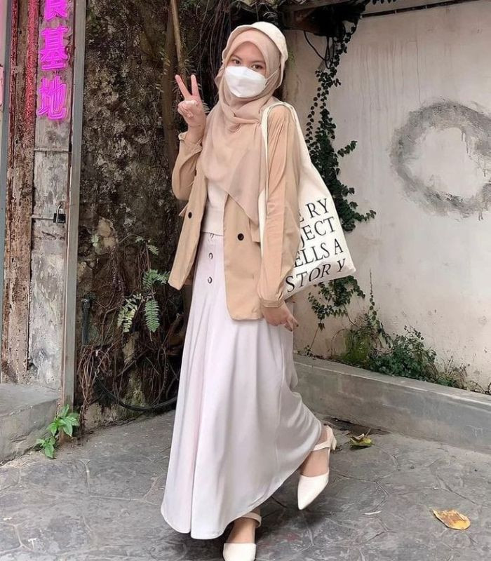 5. Bikin gaya outfit Anda jadi casual look, perpaduan t-shirt dipadukan dengan blazer bersama maxi skirt dilengkapi dengan tote bag, heels block chunky, bucket hat sebagai stand out outfit Anda.