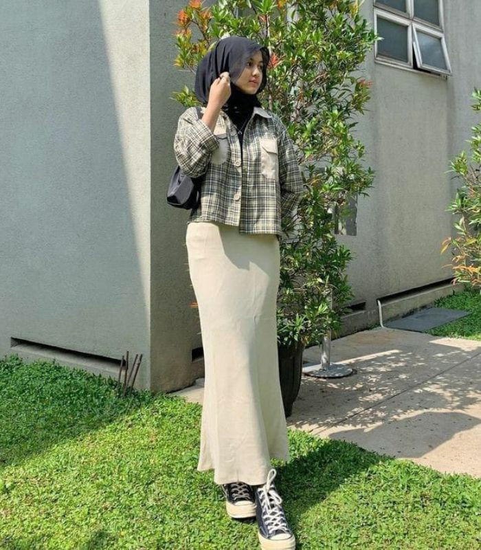 2. Mix and match kemeja crop top tartan dikombinasikan dengan straight skirt dilengkapi dengan sneakers dan shoulder bag, gaya Anda jadi lebih stylish.