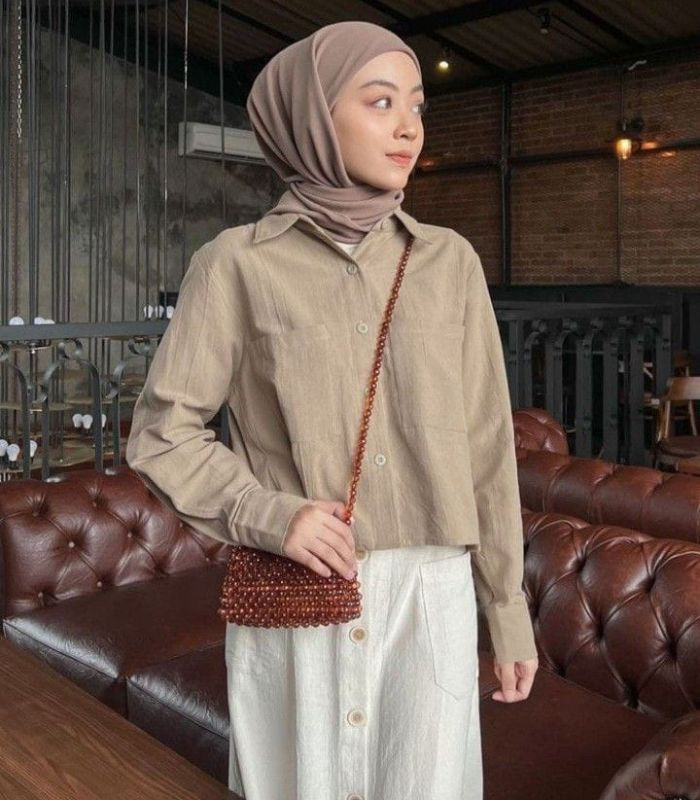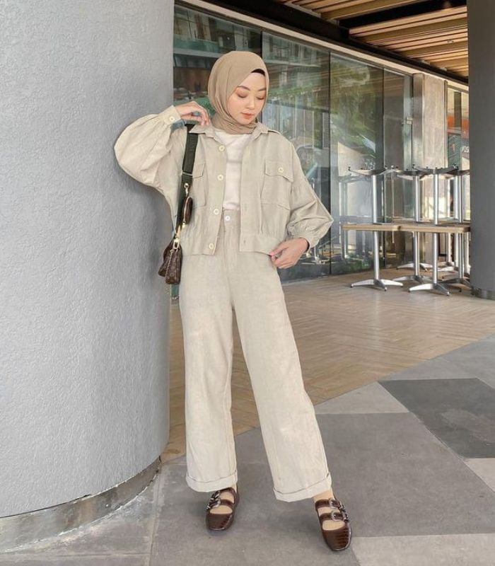3. Tampilan seperti ini bikin gaya hijab anda feminin look, lho! Padukan long sleeve t-shirt dibalut dengan kemeja crop top shirt dengan highwaist wide leg linen berwarna senada, memberikan kesan nude kalem yang manis!