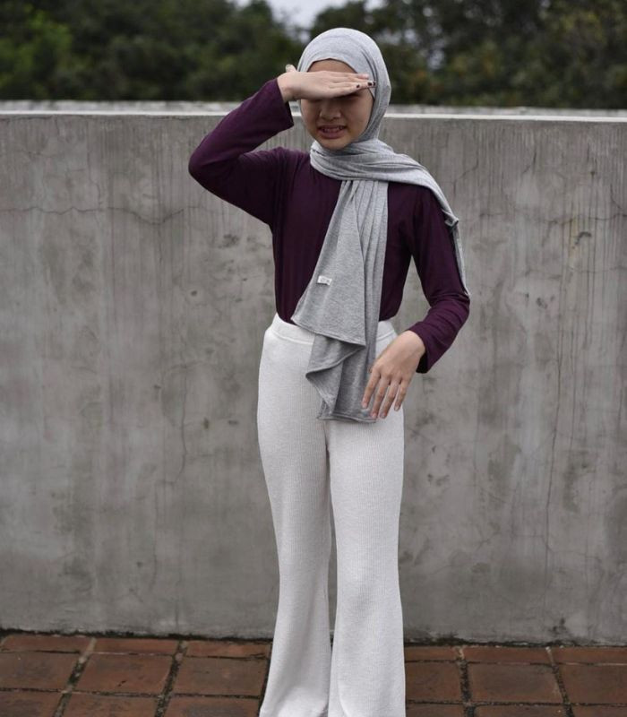 2. Gaya hijab satu ini cukup mudah untuk ditiru, kenakan long sleeves t-shirt bermotif dipadukan dengan highwaist loose knit pants berwarna senada dengan pashmina dan lengkapi outfit dengan shoulder bag favorit Anda!